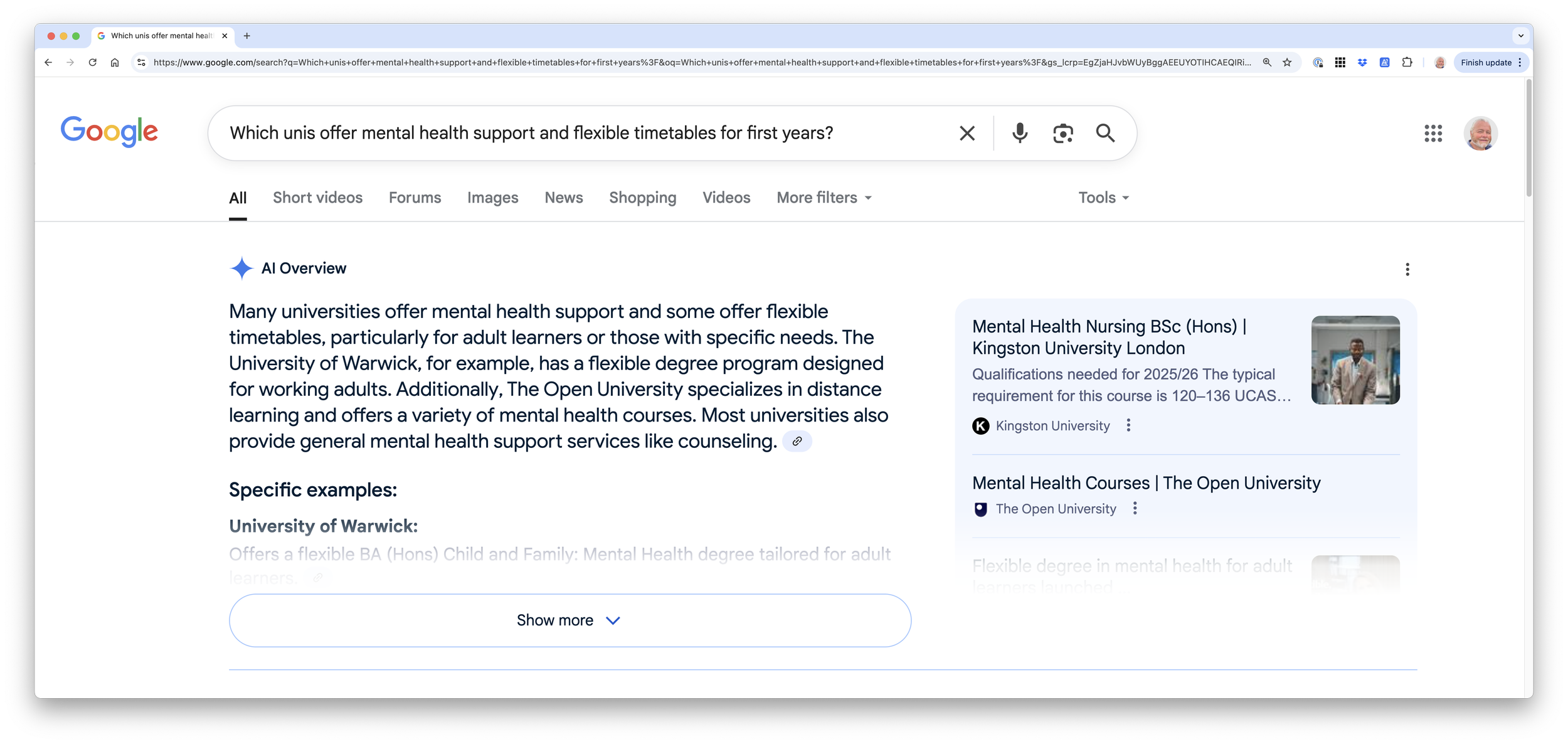 Google search results showing AI generated response to ‘universities offering mental health support and flexible timetables’.
