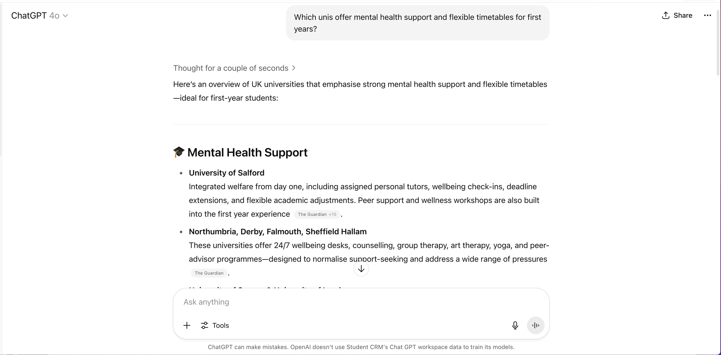 ChatGPT response listing UK universities with strong mental health support and flexible timetables for first-year students