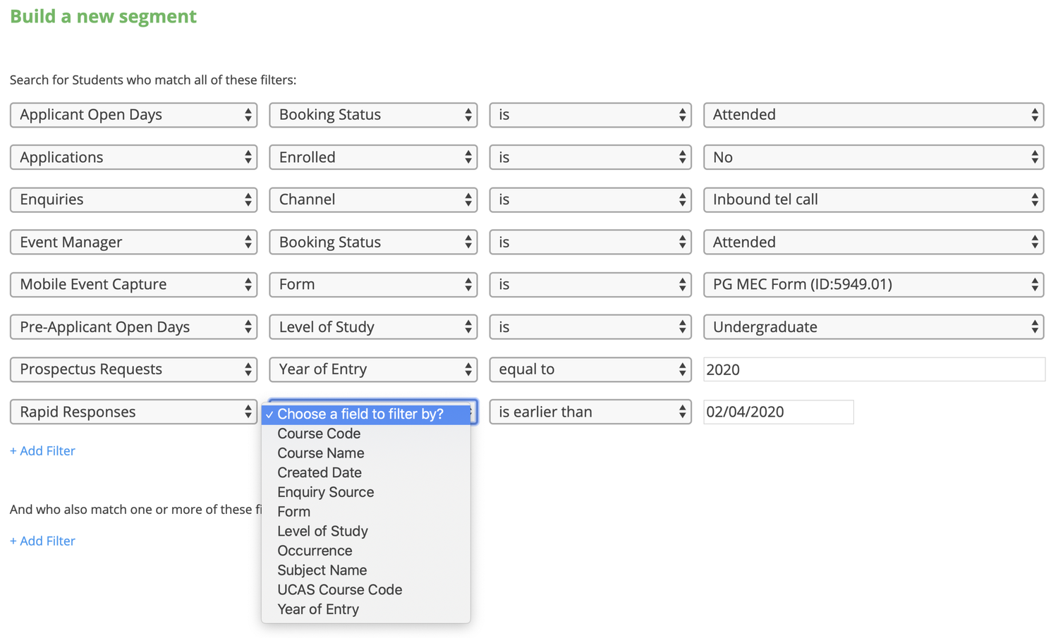 A super segment finds students who have taken part in many activities, such as 'made an enquiry', 'attended an open day', 'applied for 2020 entry', and then 'enrolled'.